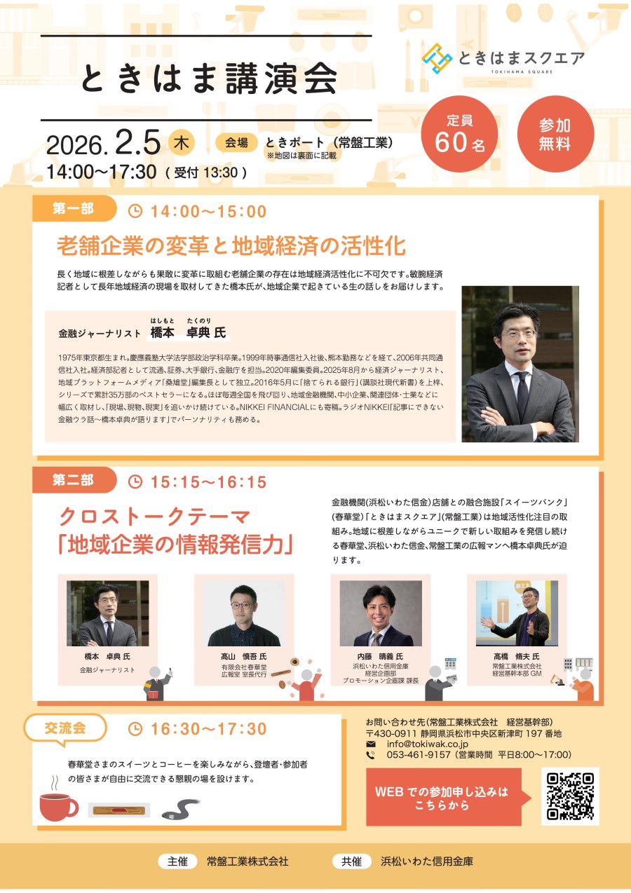 常盤工業社屋「ときPORT」では、地域企業の広報戦略や情報発信の実践に関心のある皆さまを対象に、金融ジャーナリスト橋本卓典氏を迎えた講演会を開催します。